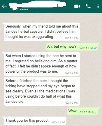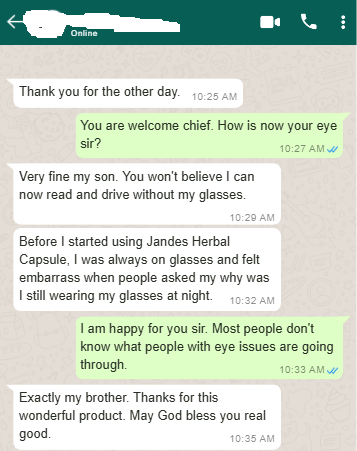 If after 21 days of using Jandes Herbal Capsule, you still find yourself suffering from the same Eye problem, you can call us back to request your money back in full. We don’t want you to keep suffering when we are holding onto your money. You paid for a cure so you should get it with Jandes.