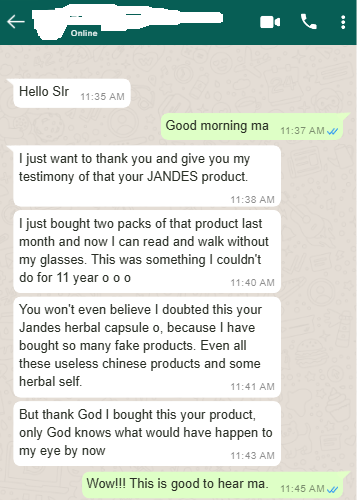 “My mother’s cataracts disappeared completely. The doctors that used to prescribe her medications from the hospital are even shocked at her speed of recovery. Thank you Jandes Herbal Capsules and thank you every that worked to make this possible!”
