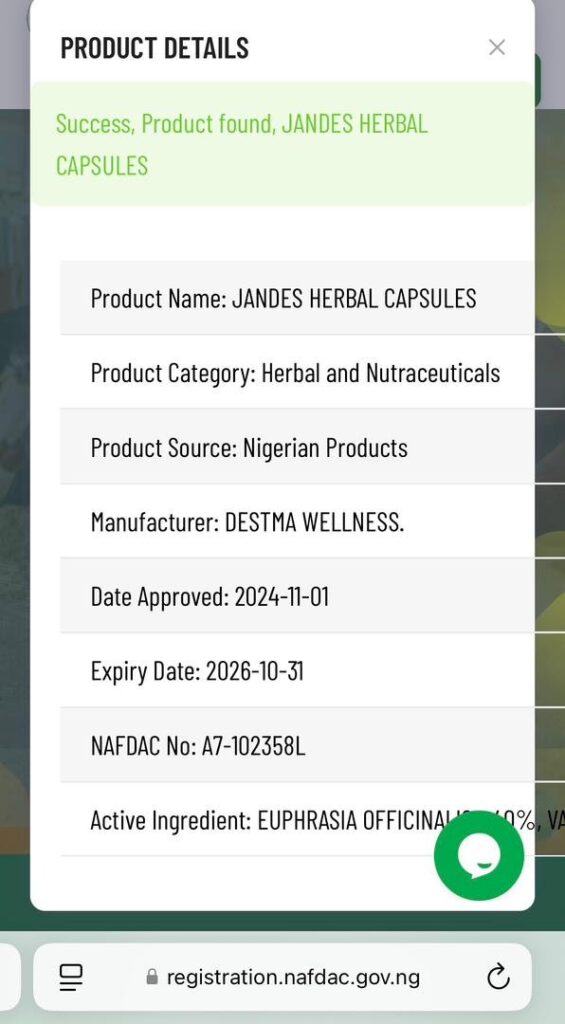 Jandes herbal capsule is NAFDAC APPROVED. PURELY NATURAL AND HIGHLY EFFECTIVE AGAINST PROBLEMATIC EYE CONDITIONS